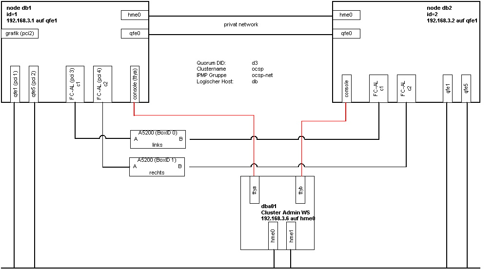 # grep db1 /etc/hosts 192.168.3.1 db1 db1.d-frust.de 192.168.3.101 db1-qfe1 192.168.3.201 db1-qfe3 172.16.0.129 db1-priv1 172.16.1.1 db1-priv2 # more /etc/hostname.qfe1 db1 group ocsp-net up addif db1-qfe1 -failover deprecated up # more /etc/hostname.qfe3 db1-qfe3 group ocsp-net -failover deprecated upWenn die drei Datein entsprechend geändert wurden können wir diesen Node rebooten: