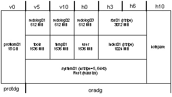 # vxdg init protdg lv0=c1t0d0s2 # vxdg -g protdg adddisk rv0=c2t32d0s2 # # vxdg init oradg lv5=c1t5d0s2 # vxdg -g oradg adddisk lv10=c1t10d0s2 # vxdg -g oradg adddisk lh0=c1t16d0s2 # vxdg -g oradg adddisk lh3=c1t19d0s2 # vxdg -g oradg adddisk lh6=c1t22d0s2 # vxdg -g oradg adddisk lh10=c1t26d0s2 # vxdg -g oradg adddisk rv5=c2t37d0s2 # vxdg -g oradg adddisk rv10=c2t42d0s2 # vxdg -g oradg adddisk rh0=c2t48d0s2 # vxdg -g oradg adddisk rh3=c2t51d0s2 # vxdg -g oradg adddisk rh6=c2t54d0s2 # vxdg -g oradg adddisk rh10=c2t58d0s2